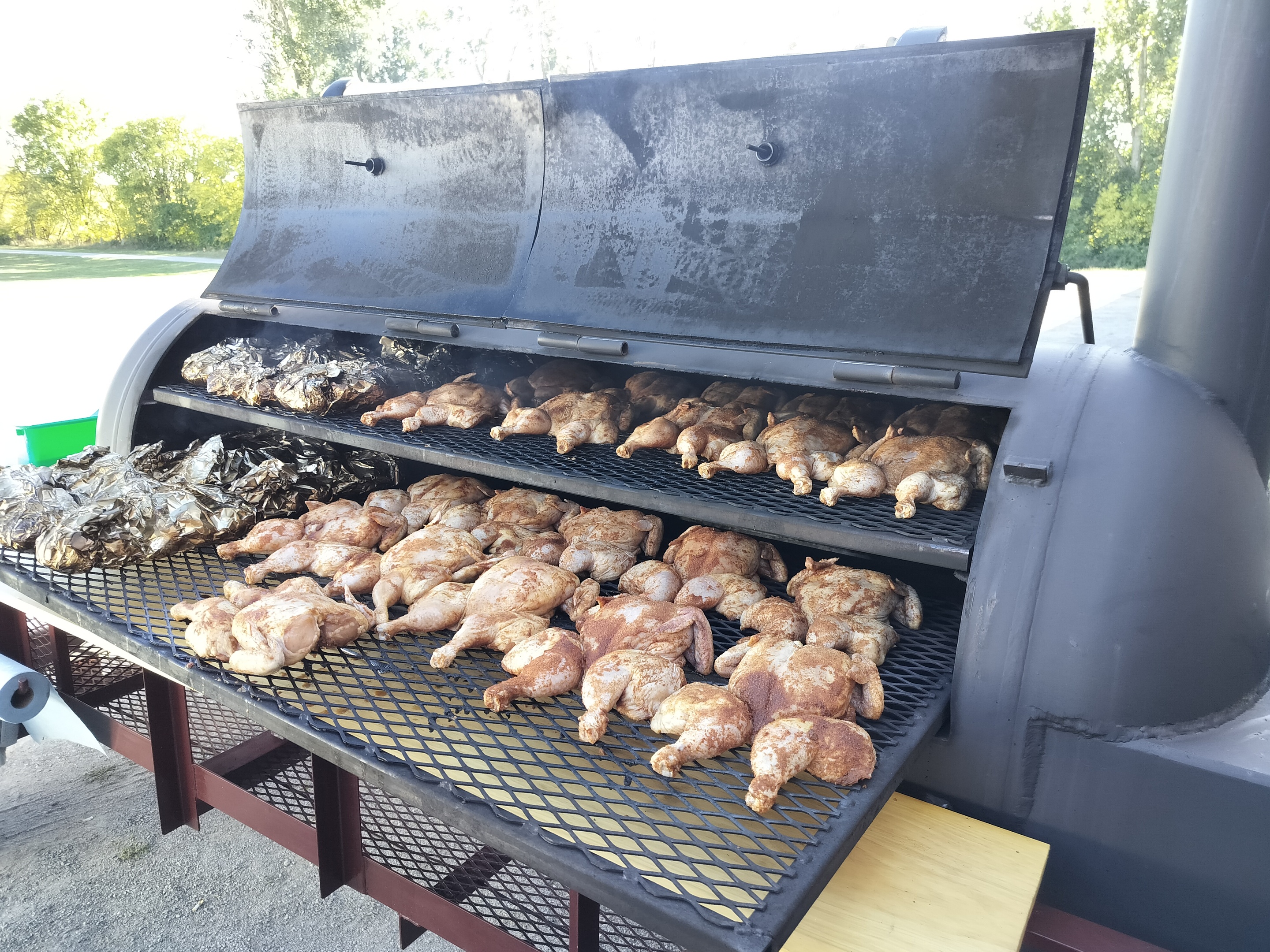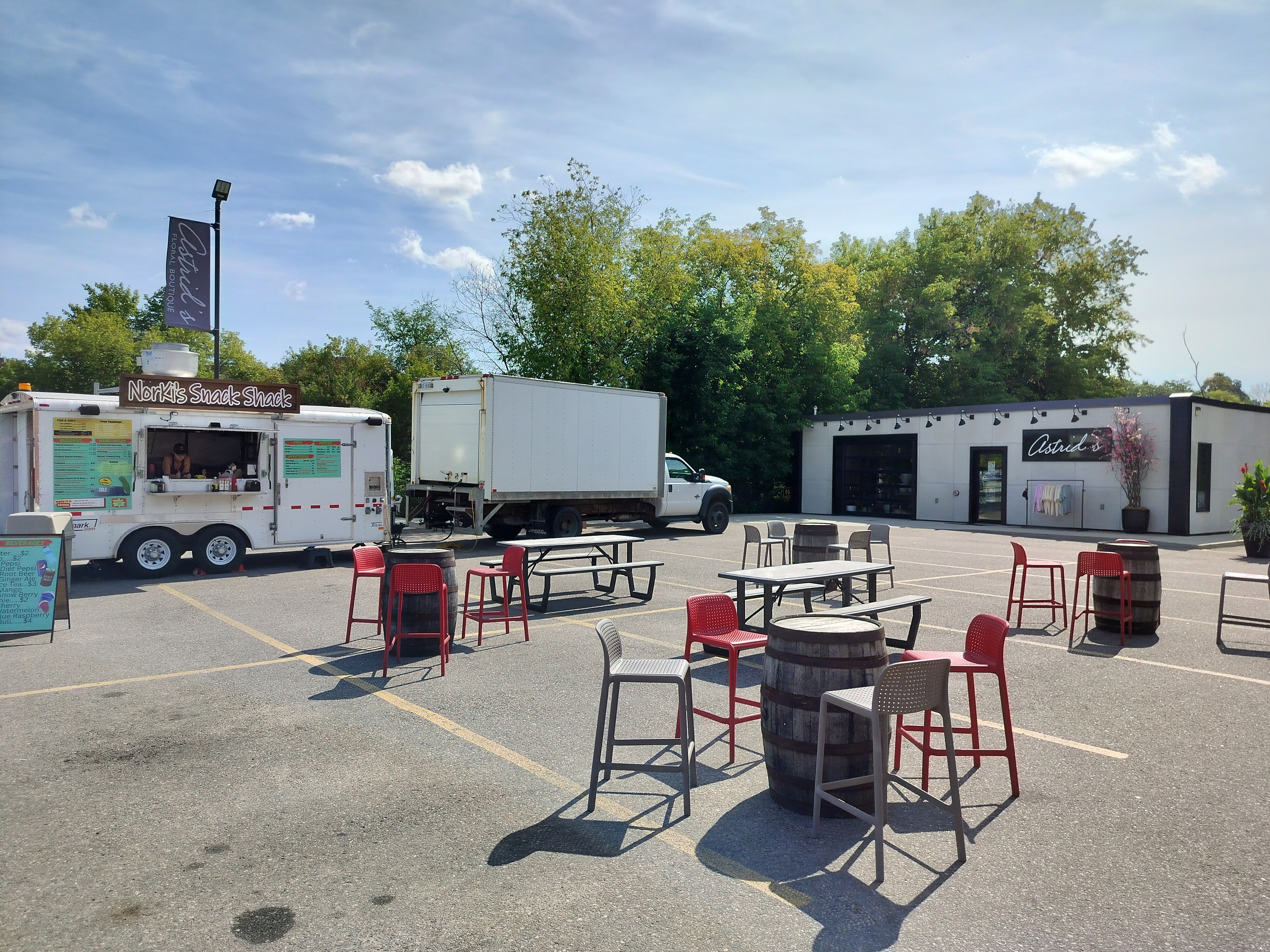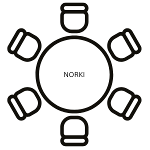We offer a seating area consisting of 2 picnic tables and 4 Whisky barrels with high back chairs