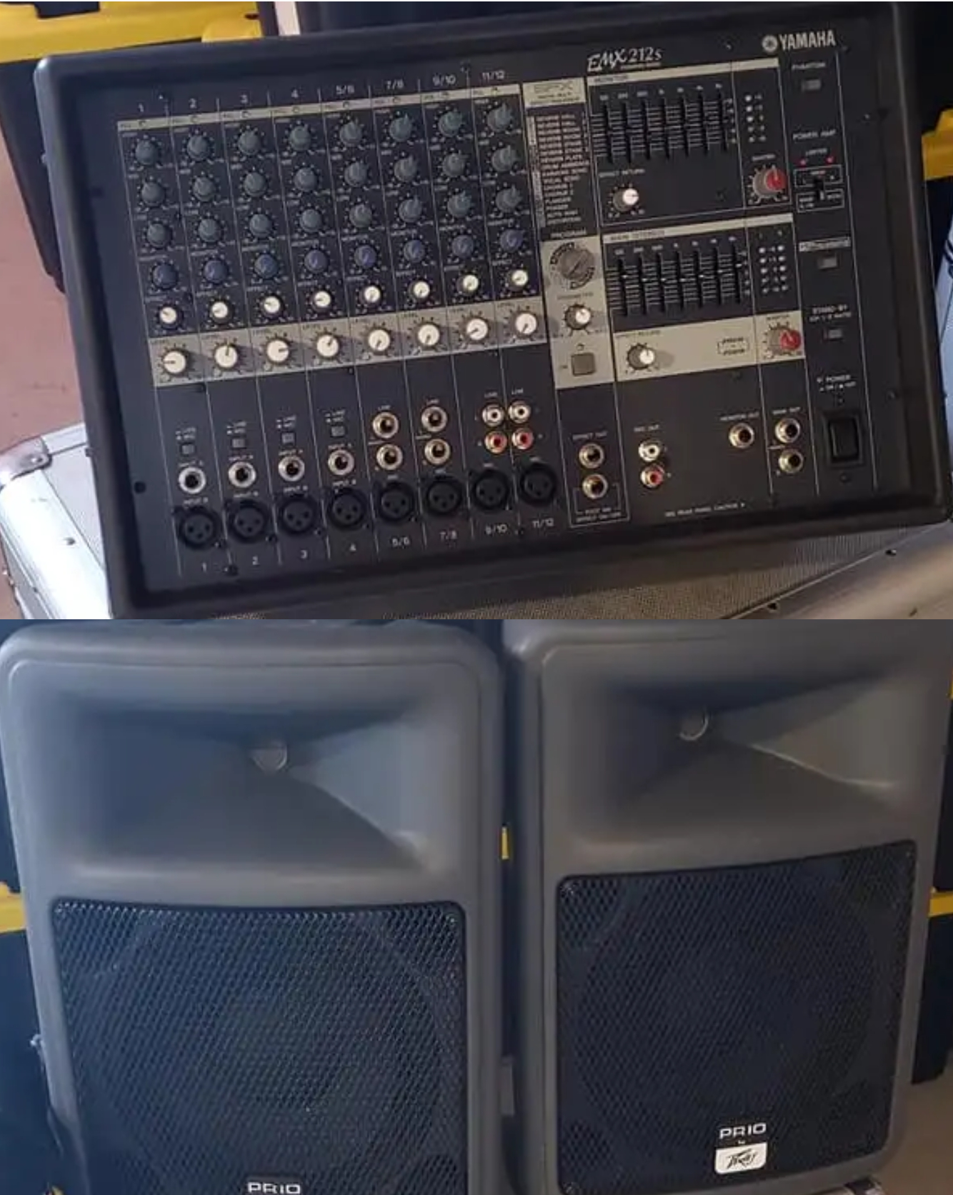 8 Channel Mixer and amp, 2 Peavey tower speakers with tripod stands and Sure microphone with stand. All cords included.